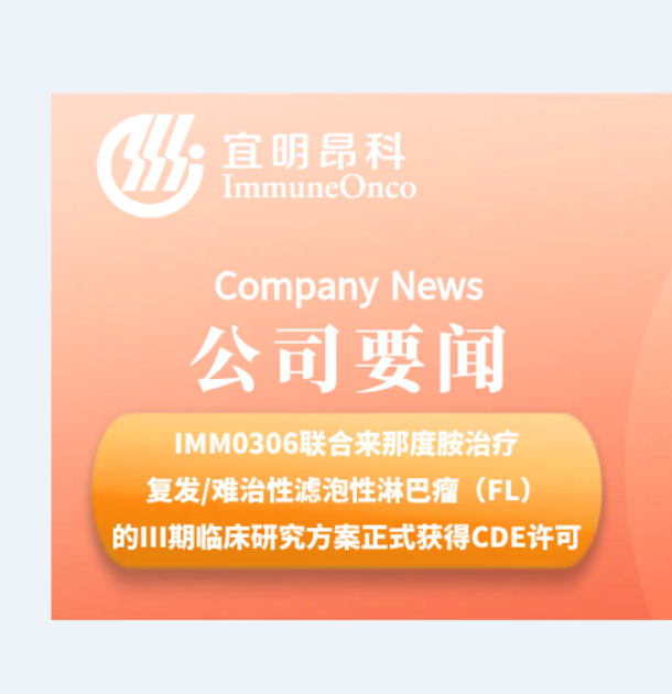 IMM0306聯(lián)合來(lái)那度胺治療復(fù)發(fā)/難治性濾泡性淋巴瘤(FL)的III期臨床研究方案正式獲得國(guó)家藥品監(jiān)督管理局藥品審評(píng)中心(CDE)許可